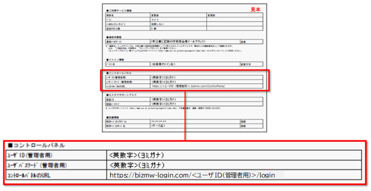 『ご利用内容のご案内』に記載されている、コントロールパネルのURL「https://bizmw-login.com/ユーザID(管理者用)/login」を、ブラウザのアドレスバーに入力してアクセスします。